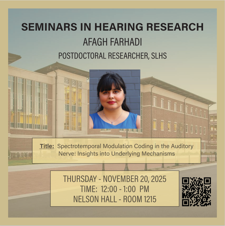 On Thursday, November 20 at 12:00-1:00 PM in NLSN 1215, Dr. Afagh Farhadi (Post-doctoral Researcher, SLHS) willpresent “Spectrotemporal Modulation Coding in the Auditory Nerve: Insights into Underlying Mechanisms” for the Seminars in Hearing Research seminar series. Please see the flyer for details.
